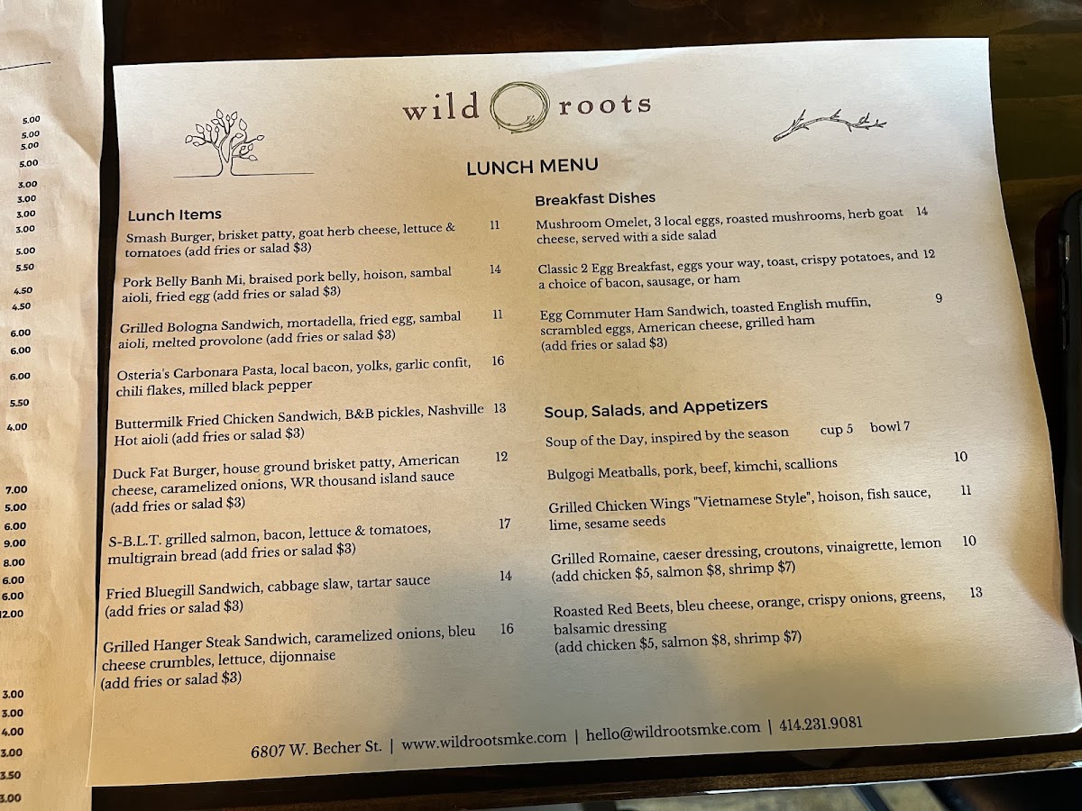 Welcome to Wild Roots Restaurant, an inviting culinary haven located at 6807 W Becher St, West Allis, Wisconsin. This eclectic eatery offers a diverse menu that celebrates both comfort food and innovative dishes. Start your day with hearty breakfast options like the Mushroom Omelet or the satisfying Egg Commuter Ham Sandwich. For lunch or dinner, indulge in the crowd-pleasing Smash Burger or the flavorful Pork Belly Banh Mi, each dish crafted with fresh, local ingredients. Don’t miss the delicious Osteria's Carbonara Pasta and the crispy Buttermilk Fried Chicken Sandwich.
